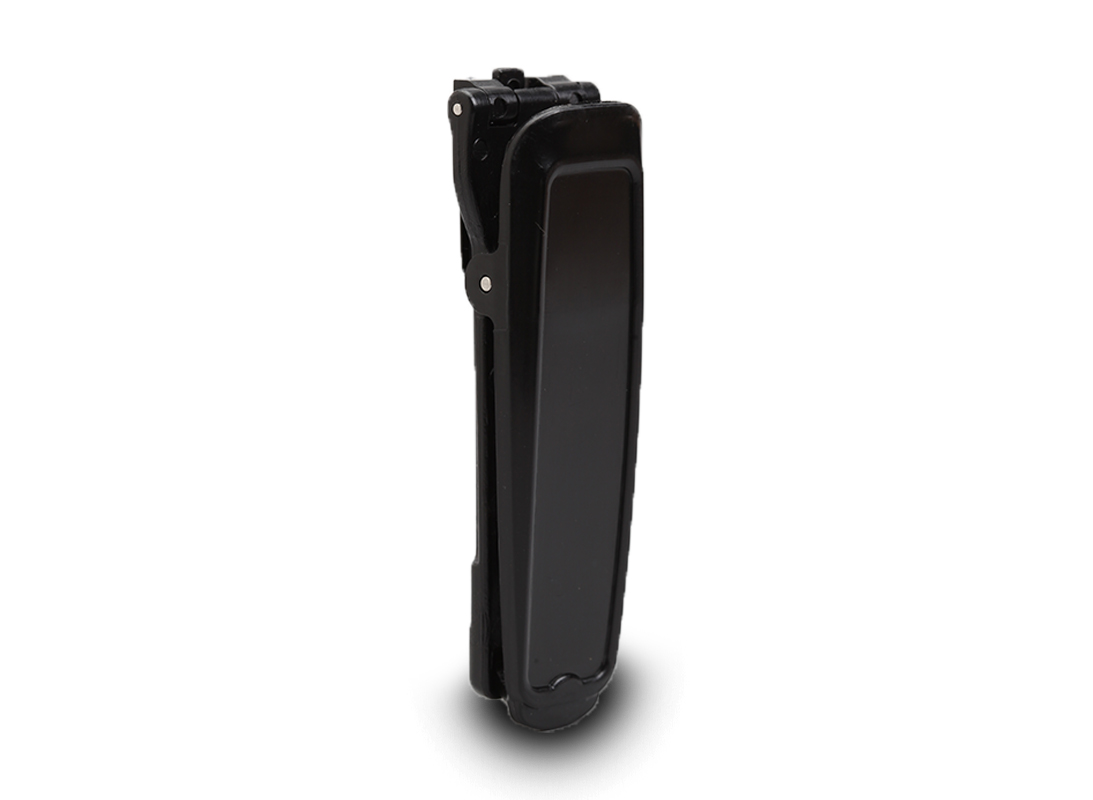 Clip per cintura di colore nero utile per portare il microinfusore MiniMed™ serie 600 o 700, fissandolo alla cintura o in vita, dotata di meccanismo basculante che permette di inclinare il microinfusore per guardare facilmente lo schermo.