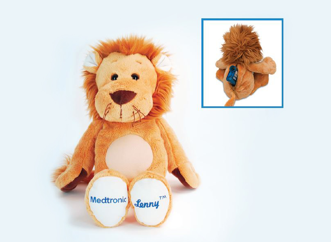 Lenny® il leone, morbido peluche con tasca porta microinfusore. Altezza 25 cm circa.